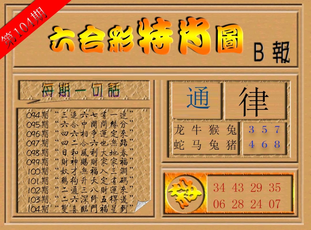 | 104期:复式连肖「猴鼠牛猪」开:0000 |